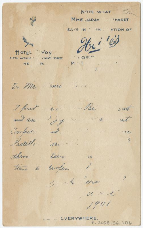 Barely legible facsimile of Sarah Berhnardt testimonial dated 1901 printed on verso. Also contains partially legible trademark
