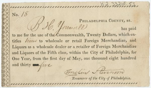 No. [blank] Philadelphia County, ss. [blank] has paid to me for the use of the commonwealth, twenty dollars, : which entitles [blank] to wholesale or retail foreign merchandize, and liquors as a wholesale dealer or a retailer of foreign merchandize and liquors of the fifth class, within the city of Philadelphia, for one year, from the first day of may, one thousand eight hundred and thirty one. [blank] Treasurer of the city of Philadelphia.