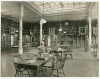 of librarian George Abbot, and interior and exterior views of the library buildings, including artifacts, at Fifth and Library