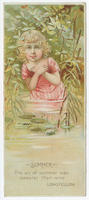 Series of advertising specimens, including trade cards, book marks, and a proof of an invitation. Prints depict a girl character