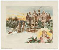 of a palatial estate in the snow with an inset showing a young white woman in evening attire; "One of the Four Hundred" showing