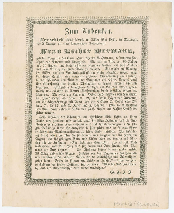 Zum Andenken. : Verschied dieses Lebens, am 22sten Mai 1851, in Maxatany, Berks Caunty, an einer langwierigen Auszehrung: Frau Esther Hermann, geliebte Ehegattin des Ehrw. Herrn Charles G. Hermann, reformirten Predigers von Kutztaun und Umgegend. Sie war im Alter von 60 Jarhen und 26 Tagen, ...