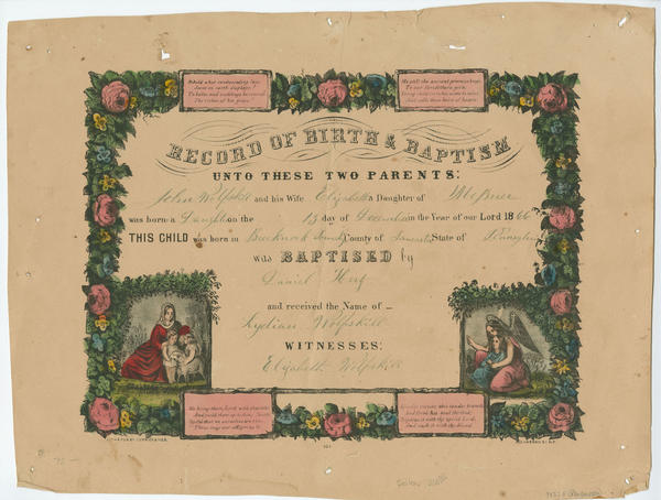 Library Company copy hand-colored; completed in MS. for Lydian Wolfskill (later Artz), born Dec. 13, 1866 in Brecknock Township,