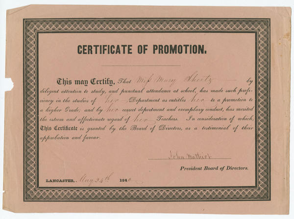 Certificate of promotion. : This may certify, that [blank] by diligent attention to study, and punctual attendance at school, has made such proficiency in the studies of [blank] department as entitles [blank] to a promotion to a higher grade; and by [blank] correct deportment and exemplary conduct, has merited the esteem and affectionate regard of [blank] teachers. In consideration of which, this certificate is granted by the board of directors, as a testimonial of their approbation and favour. / [blank] president board of directors. Lancaster, [blank] 184[blank]