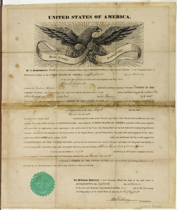 United States of America. Bucks County, Pennsylvania. : Be it remembered, that at a Court of Common Pleas, held at Doylestown, for the county of Bucks, in the commonwealth of Pennsylvania, in the United States of America, on the [blank] day of [blank] in the year of our Lord one thousand eight hundred and fifty- [blank] [blank] a native of [blank] exhibited a petition, praying to become a citizen of the United States, and it appearing to the said court that he had declared on [blank] before the [blank] on the [blank] day of [blank] A.D. 185[blank] that it was bona fide his intention to become a citizen of the United States, and to renounce for ever all allegiance and fidelity to any foreign prince, potentate, state or sovereignty whatsoever, ... / In witness whereof, I have hereunto affixed the seal of the said court at Doylestown, this [blank] day of [blank] in the year one thousand eight hundred and fifty-[blank] and of the sovereignty and independence of the United States of America, the [blank] [blank] prothonetary.
