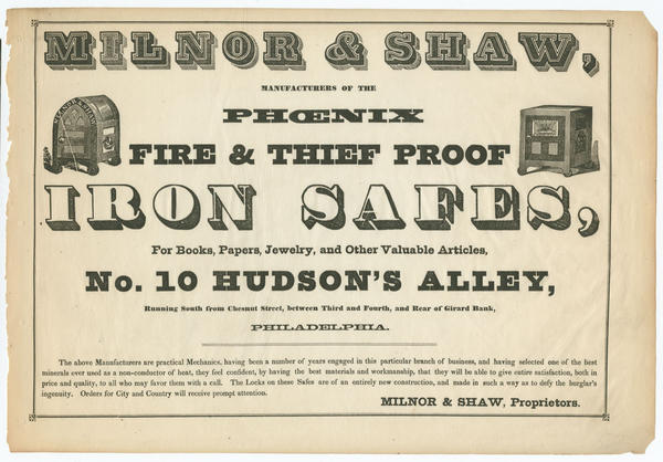 & Thief Proof Iron Safes, No. 10 Hudson’s Alley. Advertisement also includes vignettes of two different models of safe, one
