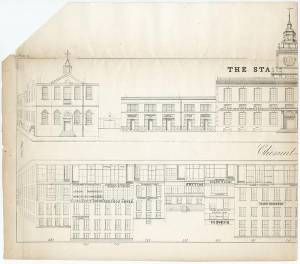 Plate depicts the 500 block of Chestnut Street (168-199 pre-consolidation). South side includes Congress Hall, the State House,