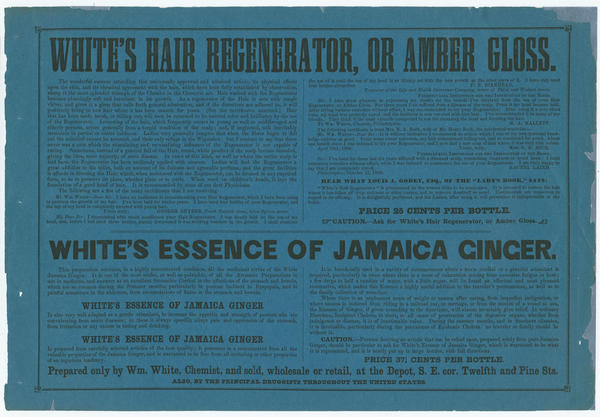 “White’s Essence of Jamaica Ginger.” Most of the small advertisements include several lines of promotional text and ornamented