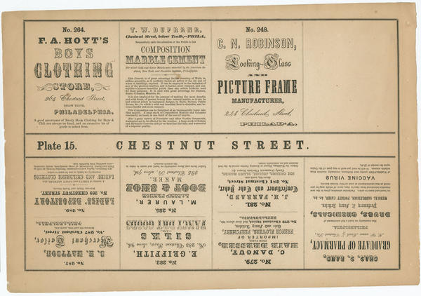 A. Hoyt’s Boy’s Clothing Store (264); T. W. Dufrene, Composition Marble Cement (Chestnut, below Tenth); Rand; Danguy; Farrand;