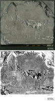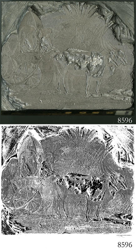 Woodblock for printing an illustration of a man and a woman in a wagon drawn by animals. |