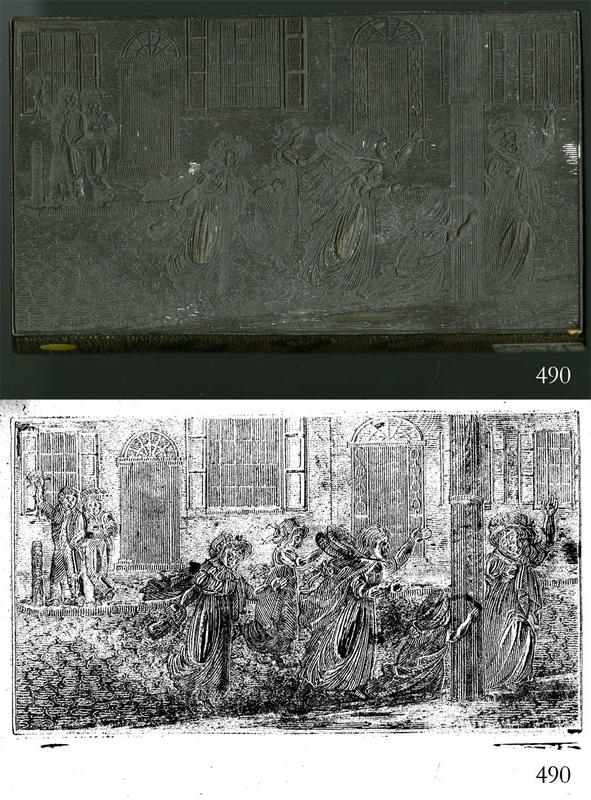 Image of several children in a street outside doorways of what appear to be two row houses; four girls, one smaller and younger,