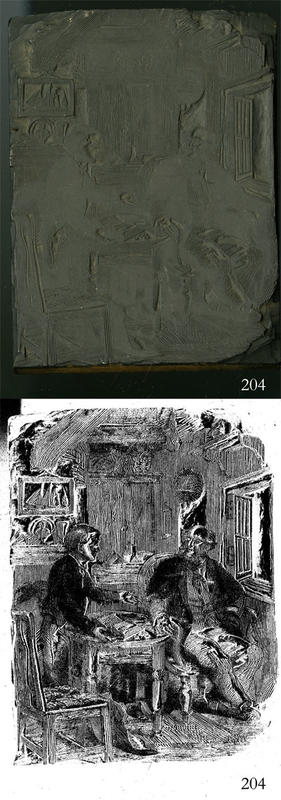 Woodblock for printing an illustration of two men at a table. |