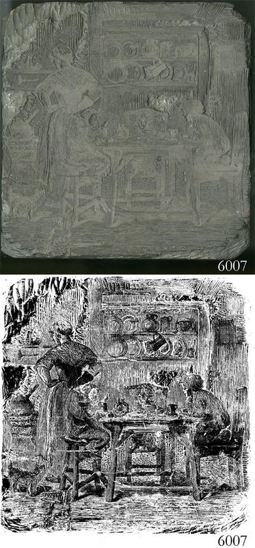 Woodblock for printing an illustration of a woman cooking and four children around a table. |