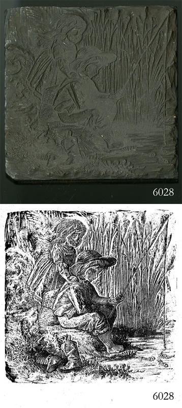 Woodblock for printing an illustration of a boy and a girl, the boy fishing. |
