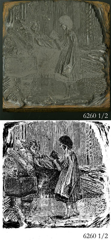 Woodblock for printing an illustration of a girl approaching a woman in bed.