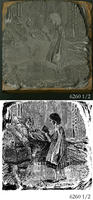 Woodblock for printing an illustration of a girl approaching a woman in bed.