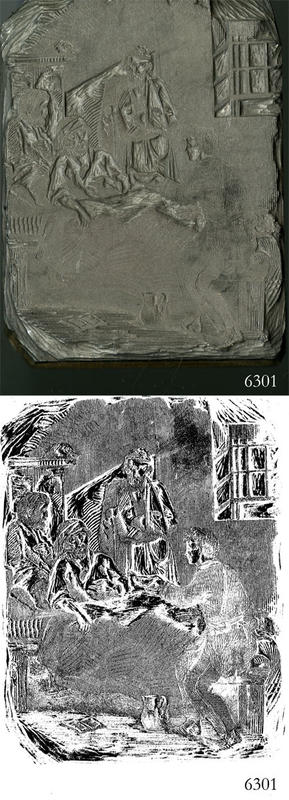 Woodblock for printing an illustration of a sick man in bed surrounded by three other men.