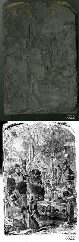 Woodblock for printing an illustration of a woman in the stocks. |
