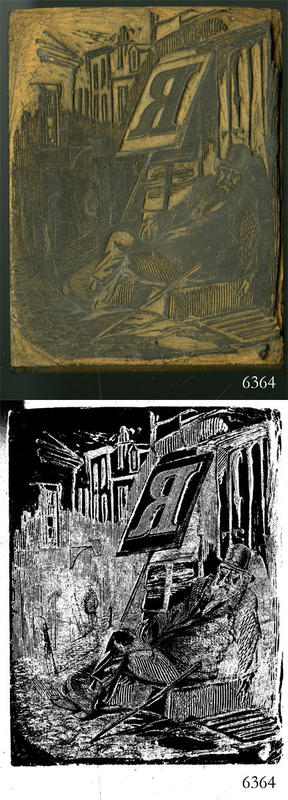 Woodblock for printing an illustration of a man and the letter R. |