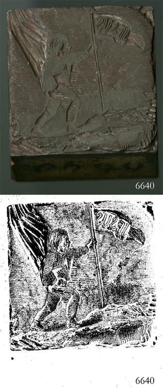 Woodblock for printing an image of a boy with a flag that says “Jesus". |