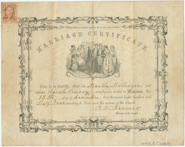Library Company copy completed in MS. for Martin Mellinger and Miss Sarah Burry [i.e. Barry], married Dec. 13, 1864, by Rev.