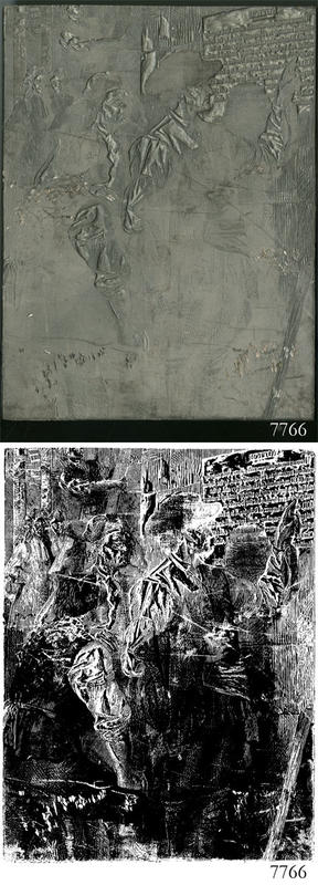 Woodblock for printing an illustration of men reading Christopher Wren’s notice against swearing at St. Paul’s Cathedral. |