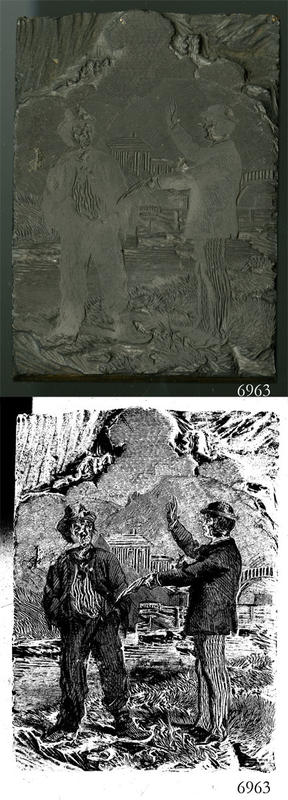 Woodblock for printing an illustration of man addressing, preaching to, or instructing another man. |
