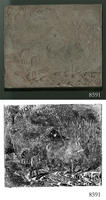 Woodblock for printing an illustration of cattle pulling a wagon with a small hut on it. |