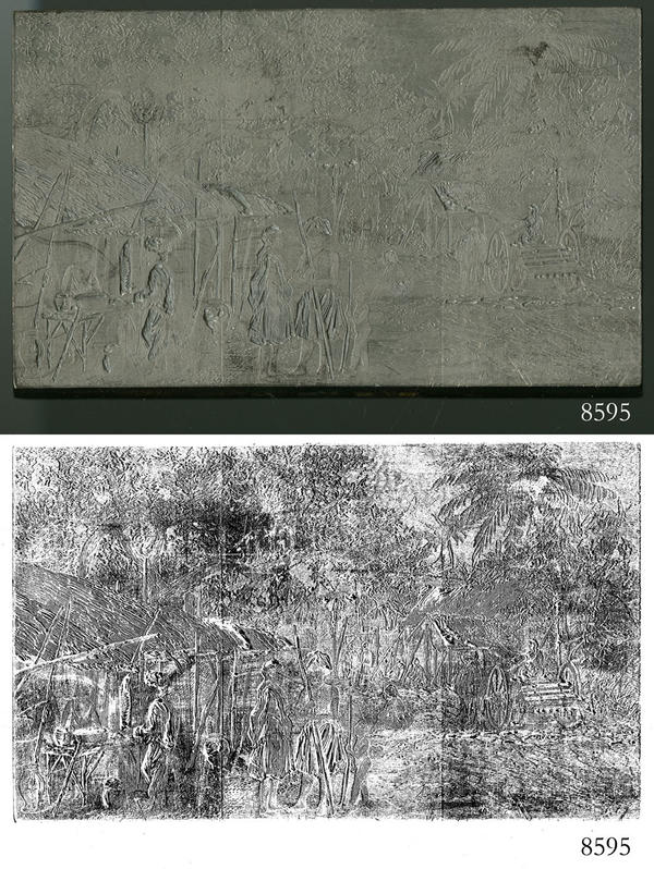the other side a man sits in or drives a small cart; elsewhere figures are standing or sitting in the distance; there are