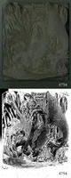 Woodblock for printing an illustration of three men, perhaps inside or outside of a tavern. |