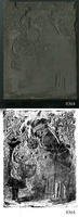 Woodblock for printing and illustration of a woman handing flowers to a girl. |