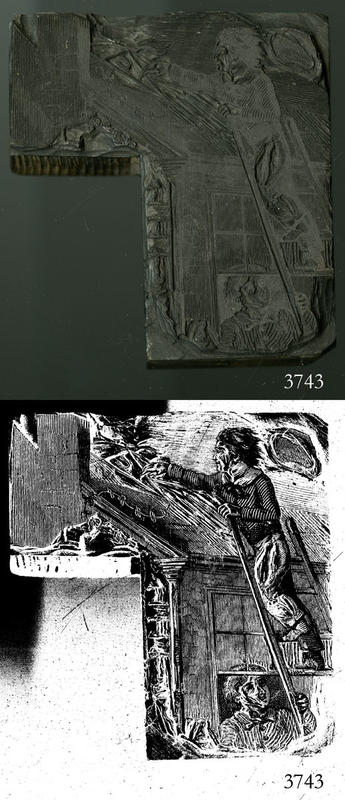 L-shaped woodblock for printing an illustration of a boy on a ladder retrieving a kite from a roof. |