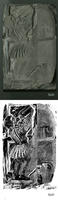 Woodblock for printing an illustration of a boy drinking out of a large bottle.