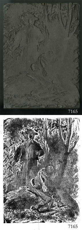Woodblock for printing an illustration of one man encountering another man in the woods. |