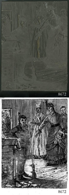 Woodblock for printing an illustration of a man with a broom standing beside a broken object. |