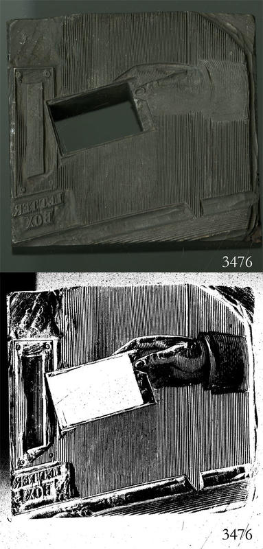 Woodblock for printing an illustration of a hand putting a letter in a slot. |