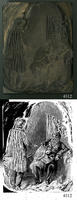 his other hand slightly; the seated man appears to regard the other with fear or sadness; behind the seated man is a candelabra,