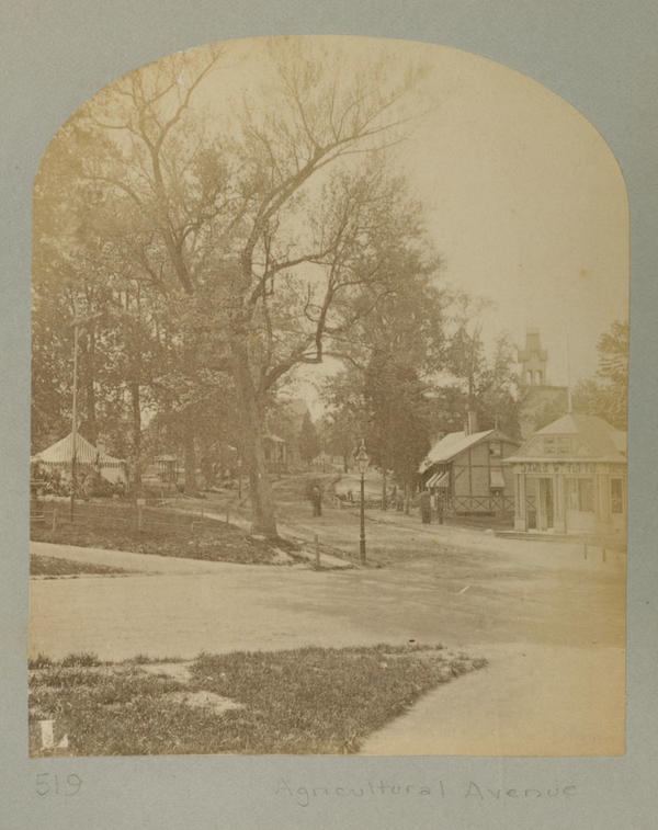 View looking down Agricultural Avenue, lined with various tents and small buildings. Depicted is a terrain of dirt paths and grass parks, clustered with with a multitude of trees. Also shown are people walking around.