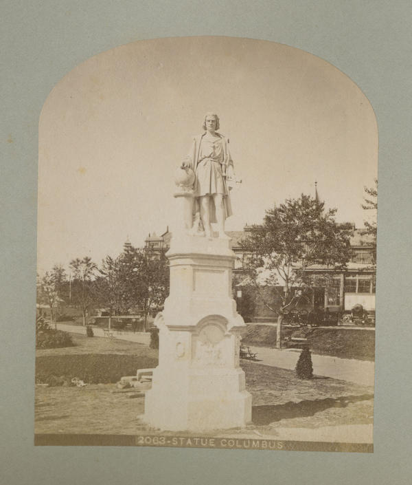 Frontal view of the statue of Columbus. Located in a park lined with pathways and trees. Depicted in the background is a building, in front of which is a cannon.