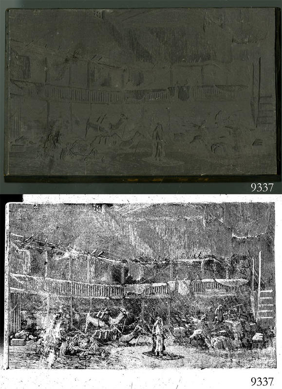 Woodblock for printing an illustration of a large barn with men and camels inside. |
