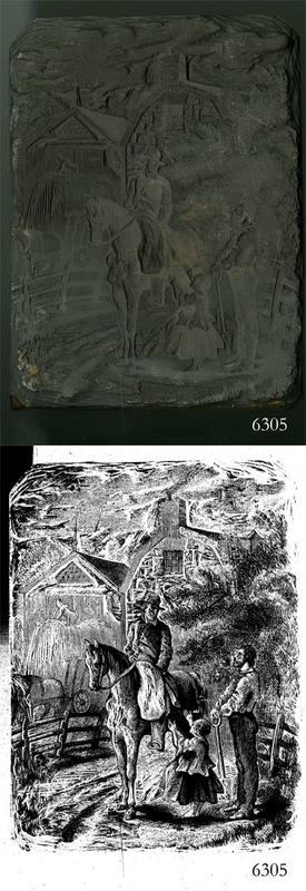 Woodblock for printing an illustration of a man on a horse and a man and girl standing. |