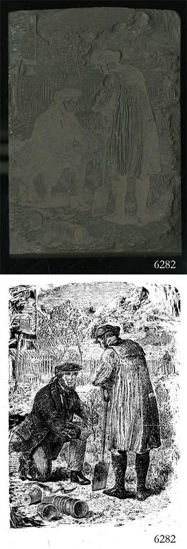 Woodblock for printing an illustration of two men planting. |