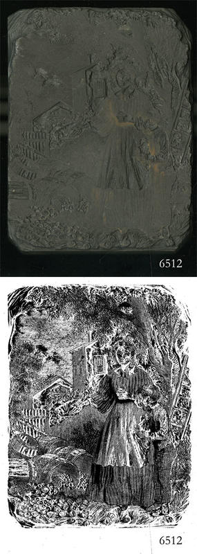 Woodblock for printing an illustration of a woman and a boy regarding overturned barrels with spilled contents. |