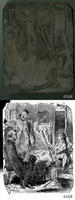 Image of an interior scene of two men, one sitting and one standing, regarding a woman lying on what appears to be a fainting