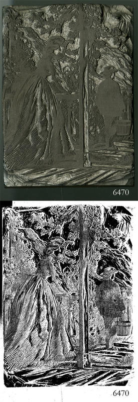 Woodblock for printing an illustration of a woman watching a man depart. |
