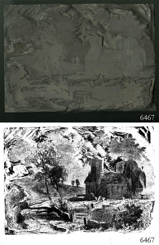 Woodblock for printing an illustration of a building surrounded by a few trees; several large stones or other objects are