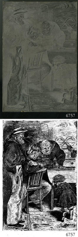 Woodblock for printing an illustration of three men regarding a small girl. |