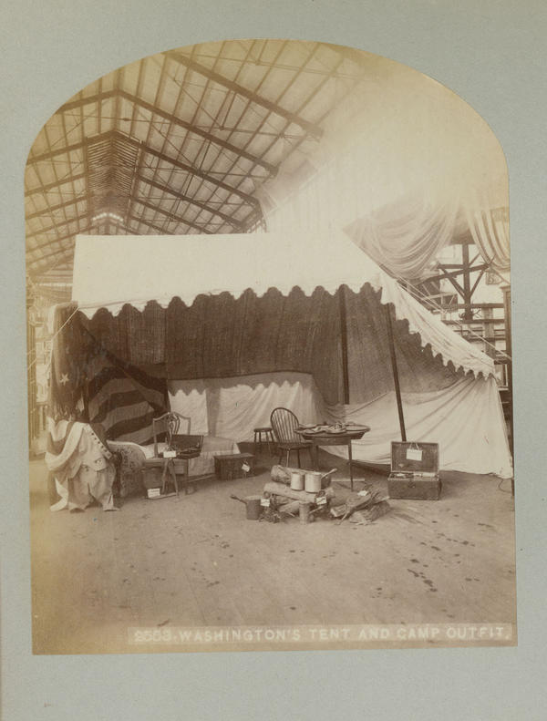 View of President Washington's tent and camp outfit in the U.S. Government Building. Depicts a tented area, chairs, a small dining table, and pots/pans surrounding firewood. Also shows an American flag draped along one side of the tent.