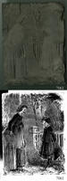 Image of a woman and a girl facing each other at a low gate; the girl looks downward and holds a bag behind her back. |