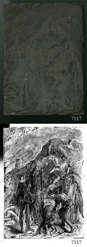 Woodblock for printing an illustration of men on mountainous terrain. |